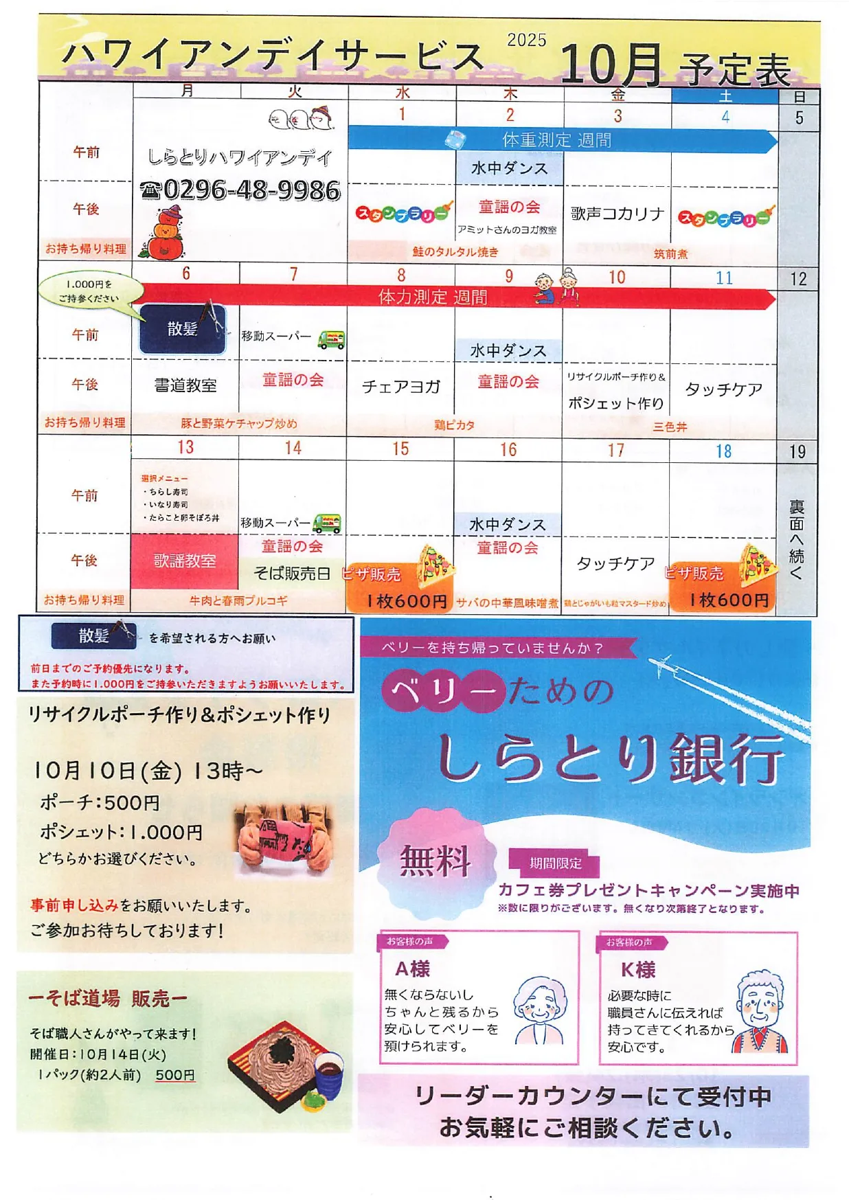 秋の深まりとともに、しらとりハワイアンデイサービスでは10月も楽しいプログラムが目白押し!