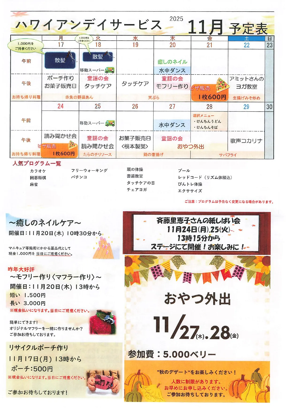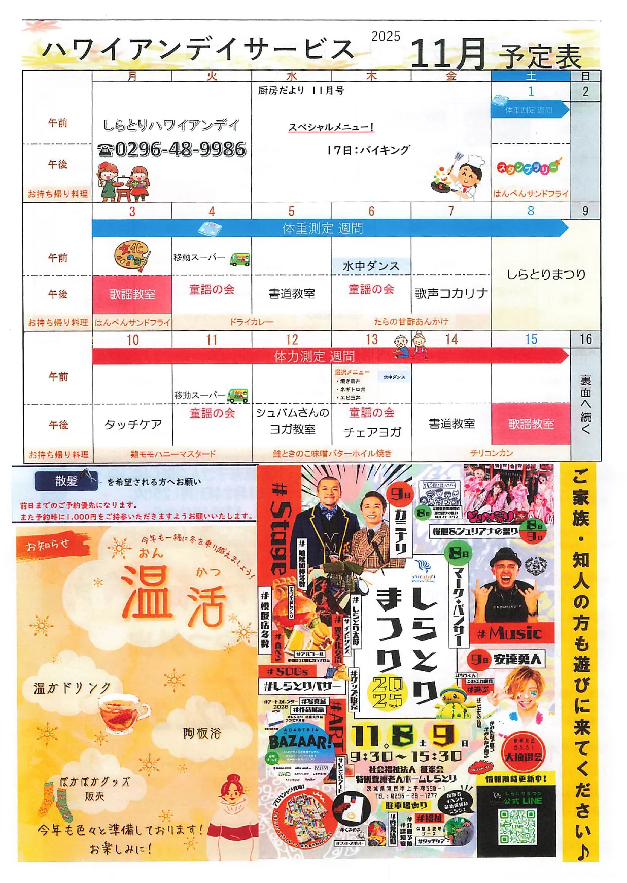 11月のしらとりハワイアンデイでは、「心も体もあたたまる」季節のプログラムが盛りだくさん!