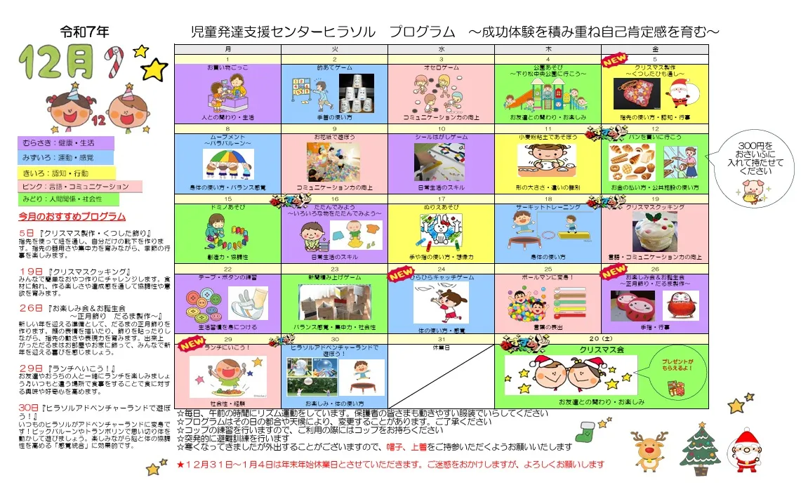 - 12月12日(金)の「パンを買いに行こう」では、300円をおさいふに入れて持たせてください 。令和7年12月も、ヒラソル一同、お子様たちの成功体験を積み重ね、自己肯定感を育むための活動を全力でサポートしてまいります 。