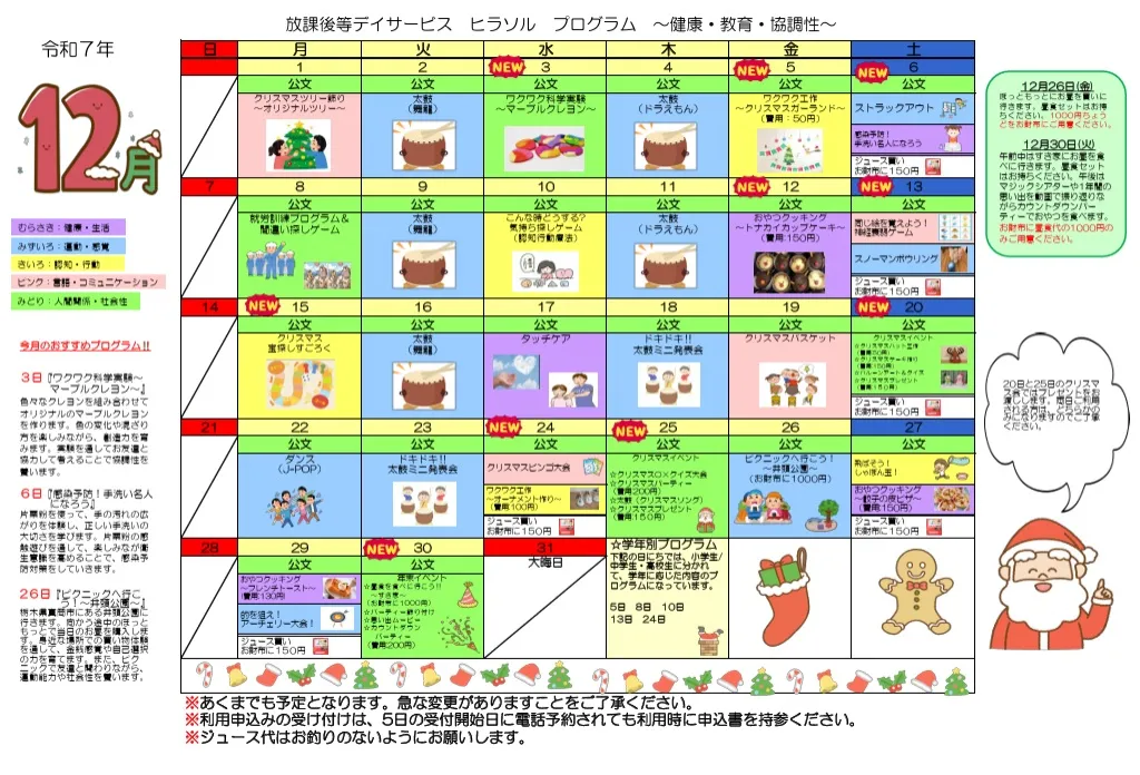 放課後等デイサービス, ヒラソル, 令和7年12月, プログラム, クリスマス, 科学実験, クッキング, 感染予防, 協調性, 認知行動療法, 就労訓練, 太鼓, 感覚統合