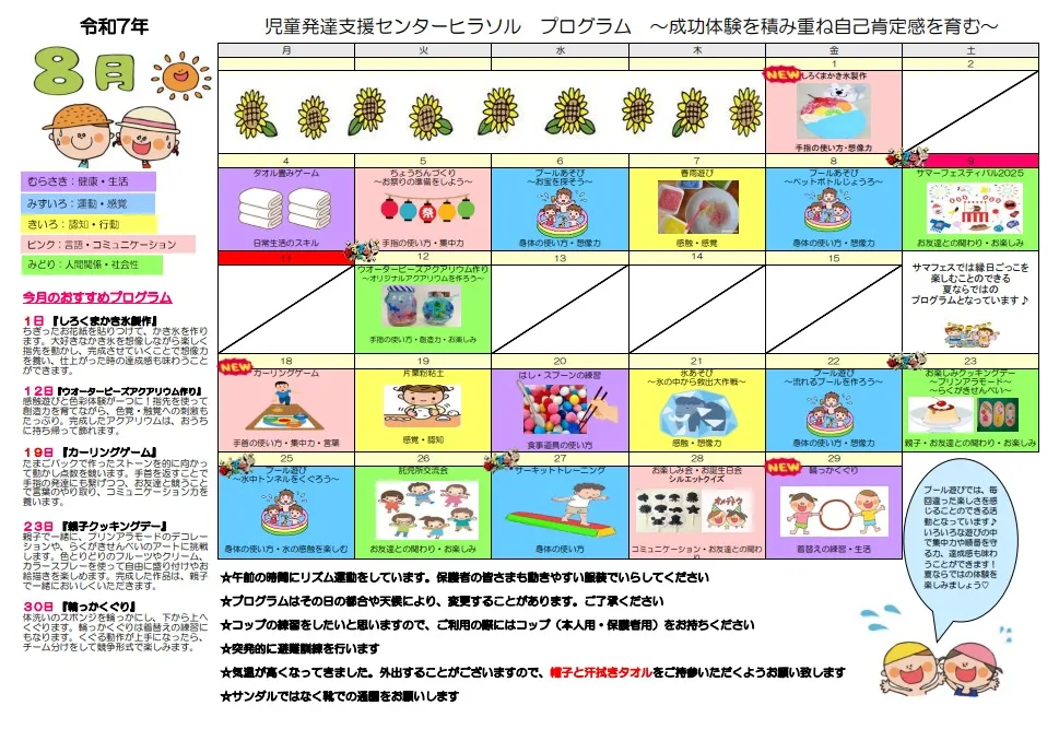 児童発達支援センターヒラソルの、8月のプログラムを公開します。ご利用お待ちしております!