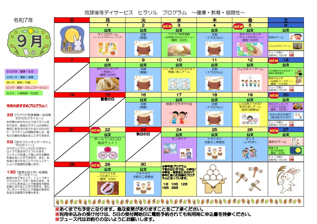 ライフサポートヒラソル放課後等デイサービスの、9月のプログラムを公開します。ご利用お待ちしております!