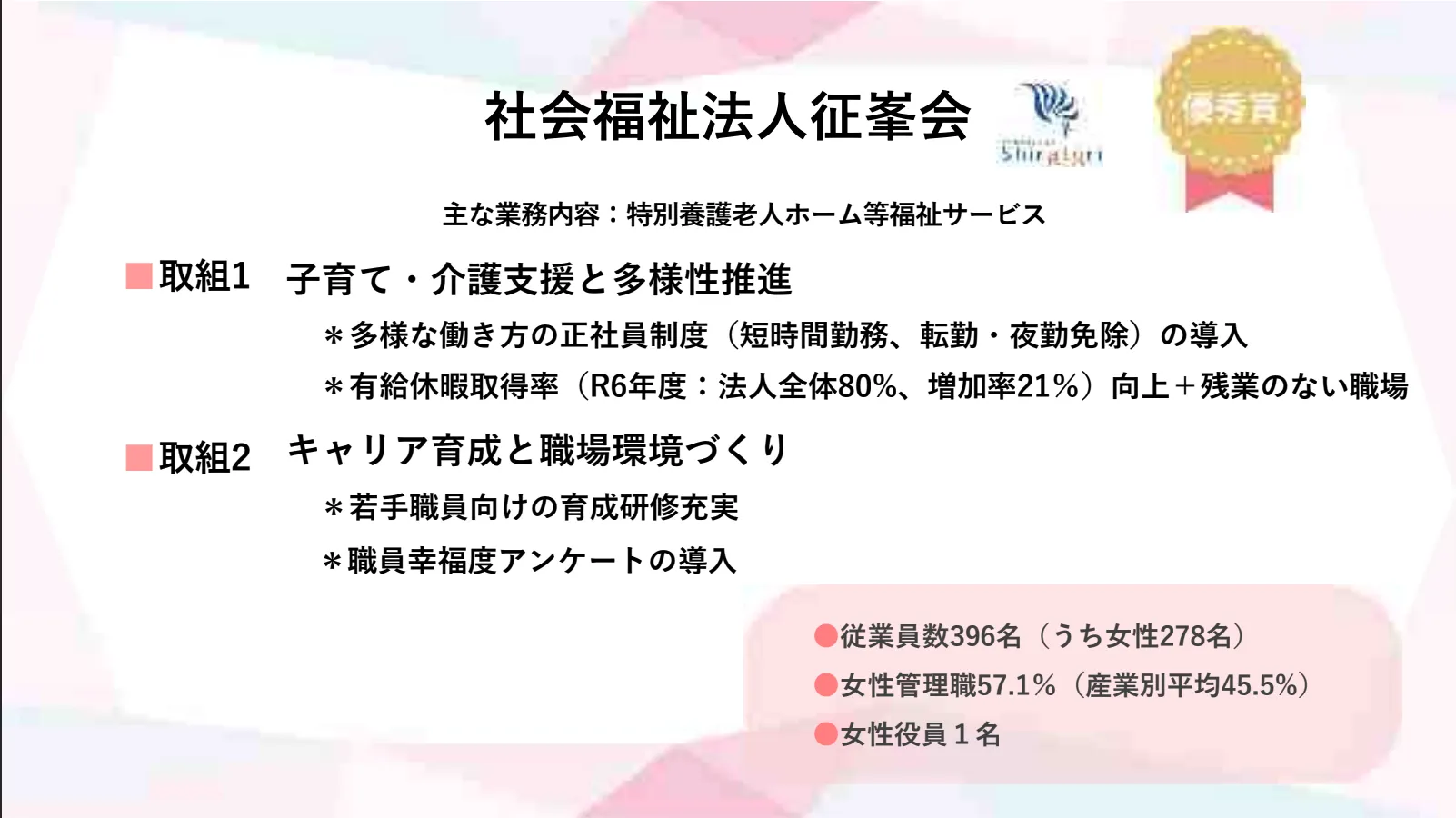 当法人が進めてきた、ライフステージに合わせた柔軟な正社員制度の導入や、有給休暇の取得促進といった「誰もが自分らしく働ける環境づくり」が、県の先進的な取り組みとして認められたものです。