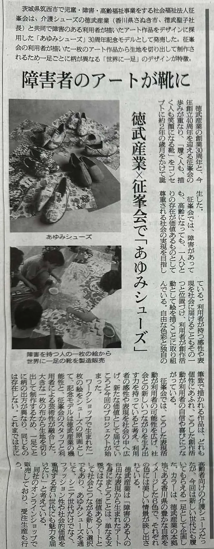 介護シューズの国内シェアトップを誇る徳武産業様の創業30周年、そして当法人・征峯会の創業40周年の節目を記念し、2年近い歳月をかけて共同開発したのが、この「あゆみシューズ」の記念モデルです。