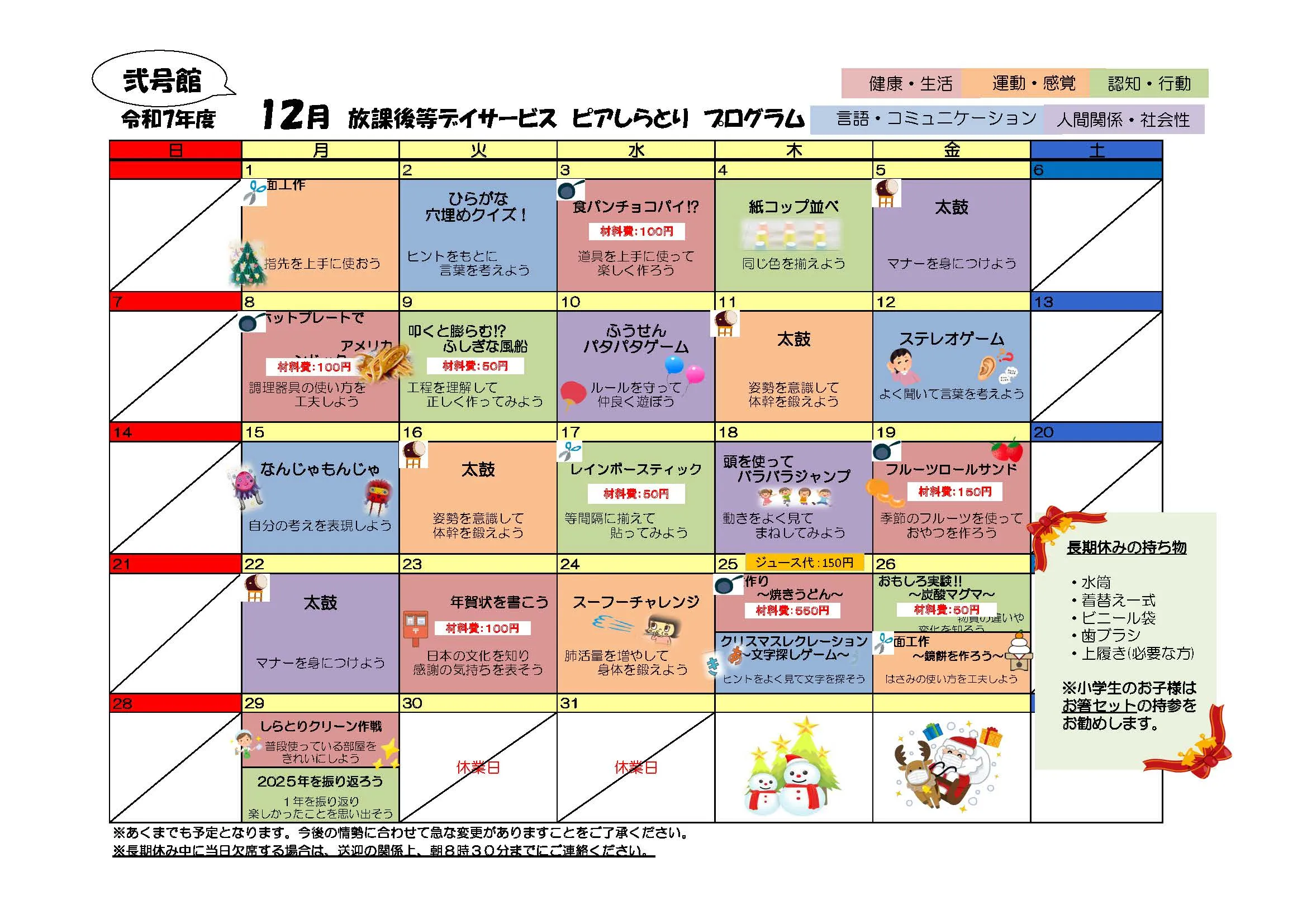いよいよ2025年を締めくくる12月が始まりました。 寒さが本格的になる季節ですが、ピアしらとり弐号館では、子どもたちが体を動かし、協力し、楽しく学べる活動をたくさん用意しています。今月も、子どもたちの成長を促す多彩なプログラムでお待ちしています。