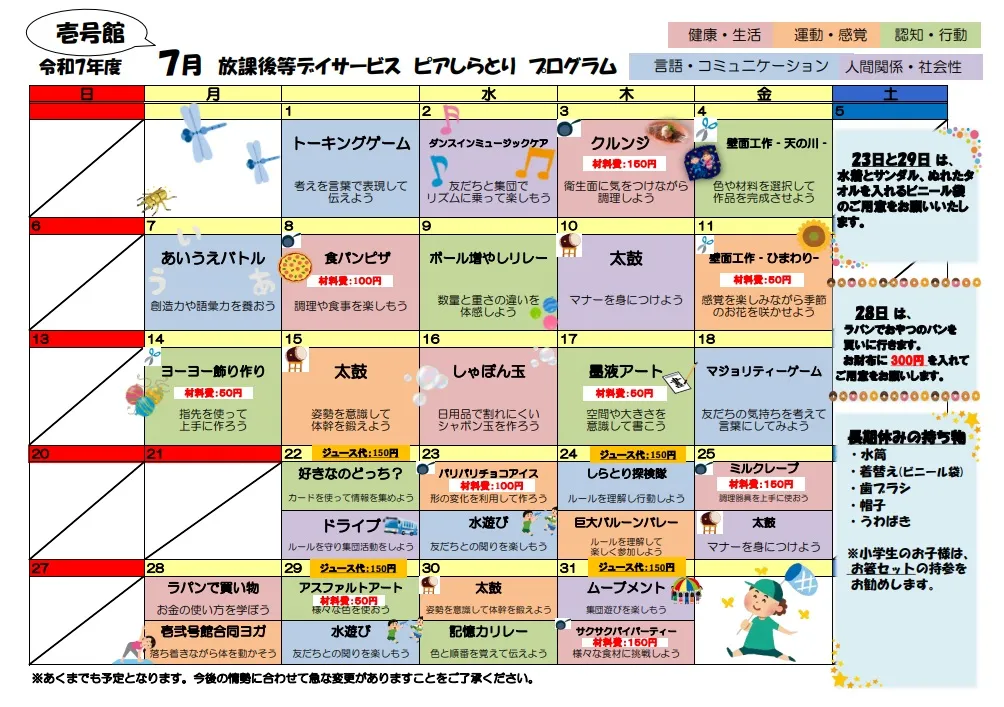 いつもピアしらとり放課後等デイサービスをご利用いただきありがとうございます。7月も「健康・生活」「運動・感覚」「認知・行動」「言語・コミュニケーション」「人間関係・社会性」の5つの視点に沿った、バラエティ豊かなプログラムを実施します。お子さま一人ひとりの興味や発達段階に合わせた体験を通じて、楽しみながらスキルアップを図ることを目指しています